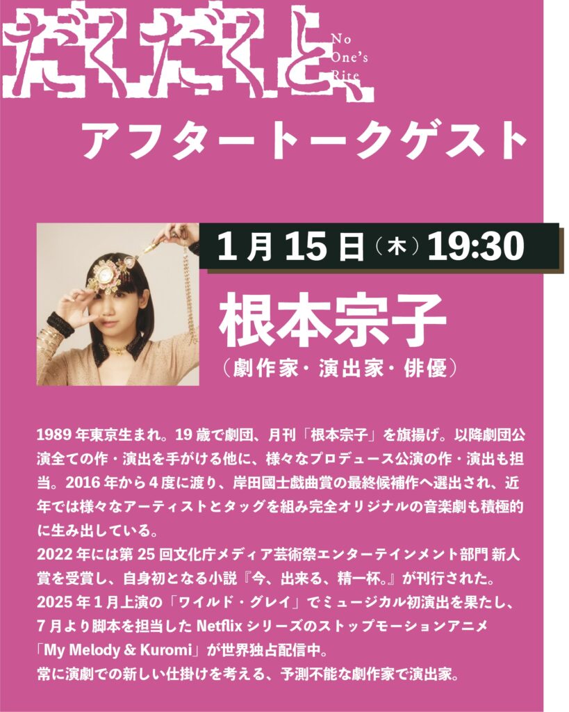 ◉1/15(木) 19:30回 劇作家・演出家・俳優 根本宗子さん